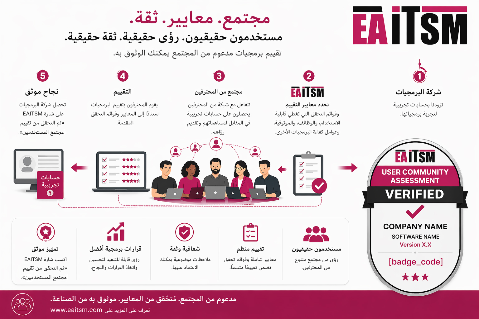 قرار الاعتماد وإصدار الشارة:تحصل المنتجات البرمجية التي تنجح في تحقيق المعايير المطلوبة على شارة تم التحقق من تقييم مجتمع المستخدمين، والتي يمكن عرضها على المواقع الإلكترونية، وصفحات المنتجات، والعروض التجارية، والكتيبات، والمواد التسويقية.