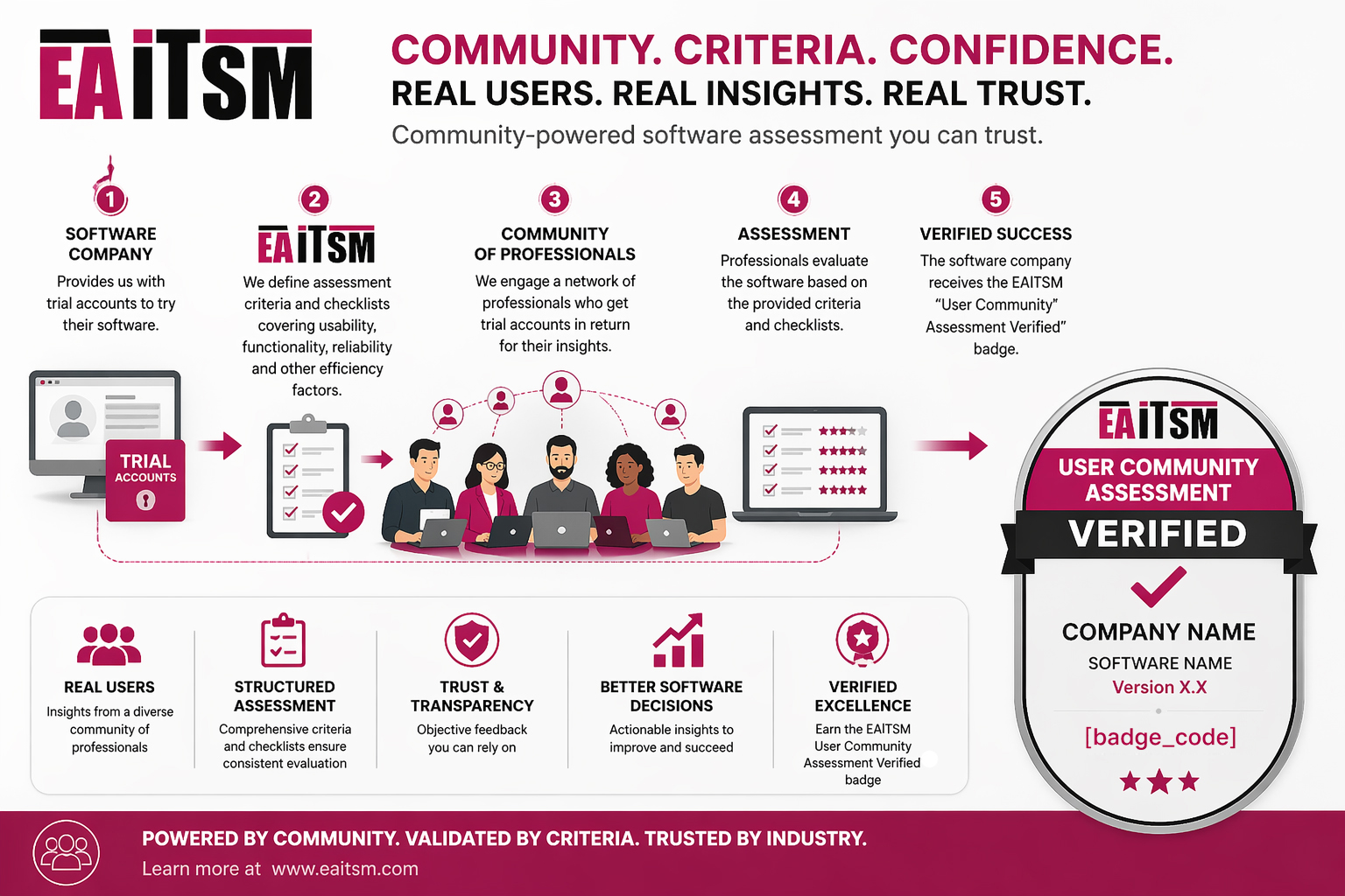 Build trust, strengthen your market reputation, and showcase product quality with our User Community Assessment Verification Service. This unique service connects software vendors with a qualified network of independent professionals who evaluate software products using structured assessment criteria and real-world usage scenarios.